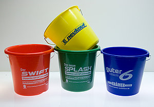 Kugelschreiber, Eimer, Rohre - alles, was irgendwie rund ist, können wir mit Ihrem Corporate Design versehen. Auf unseren Spezialmaschinen wird das Objekt am Sieb vorbei gedreht. Was hier allerdings nicht geht, sind hohle Bereiche - also Flächen mit einem Innenradius, an die man  mit einem Sieb natürlich nicht heran kommt. Aber dafür gibt es ja den Tampondruck.